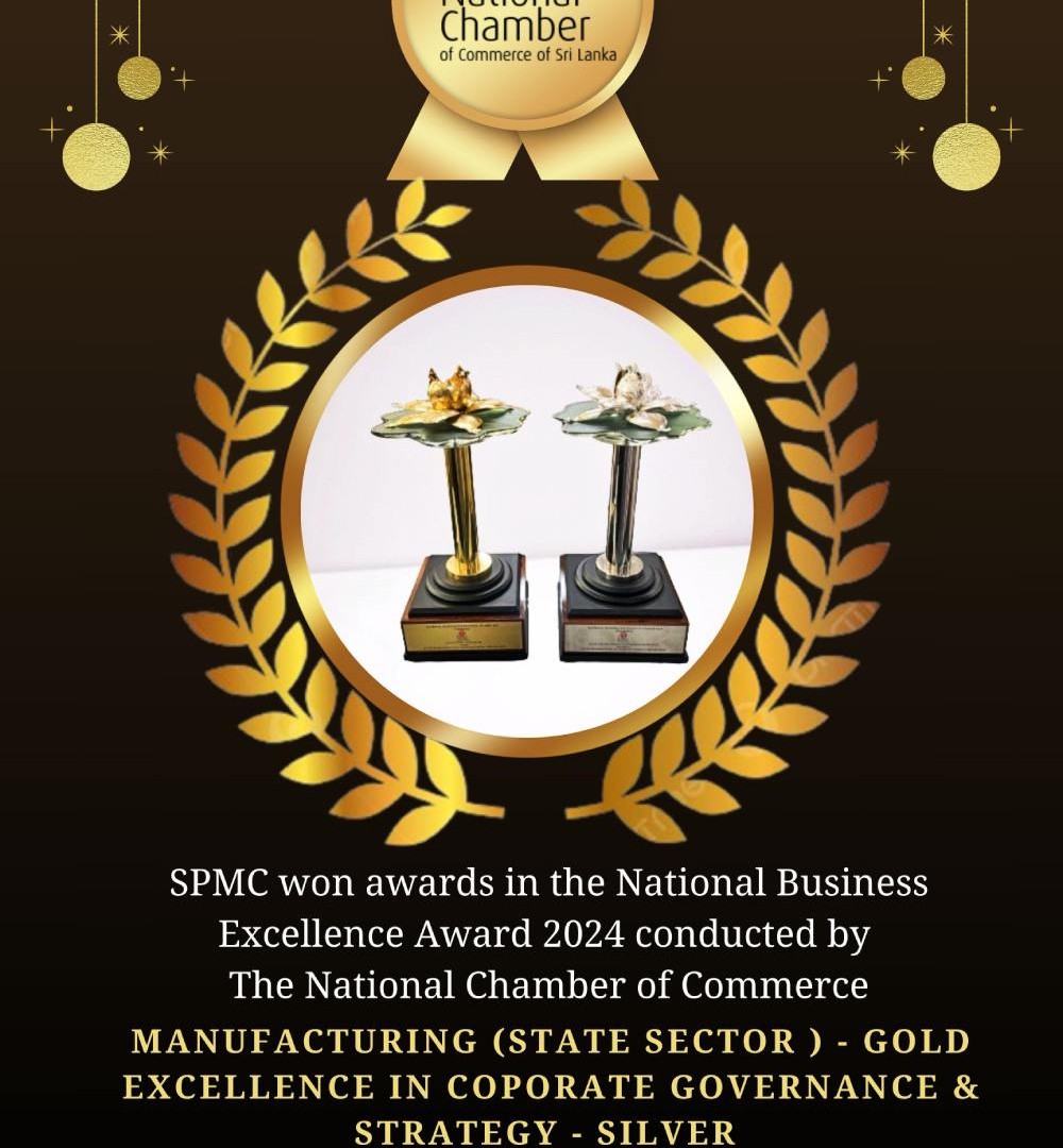 The National Business Excellence Awards, recognized as a reputed business excellence benchmark competition with a history spanning more than 19 years, are presented by the National Chamber of Commerce of Sri Lanka (NCCSL). These awards aim to recognize business enterprises that have demonstrated excellence in business while contributing to the economic progress of the country. In 2024, 220 applicants have collected the application, and 148 applied for the awards. Out of these 148 applicants, 90 were qualified for evaluation, and 76 were named as nominees. Finally, 26 applicants received the National Business Excellence Awards. SPMC was awarded with two accolades: the Gold Award for Best Manufacturer in State Sector and the Silver Award for Excellence in Corporate Governance and Strategy.