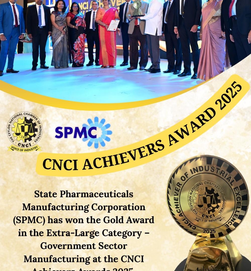 SPMC Won Gold Award - 2025 State Pharmaceuticals Manufacturing Corporation(SPMC) has won the Gold Award in the Extra-Large Category – Government Sector Manufacturing at the CNCI Achievers Awards 2025,organized by the Ceylon National Chamber of Industries (CNCI)
